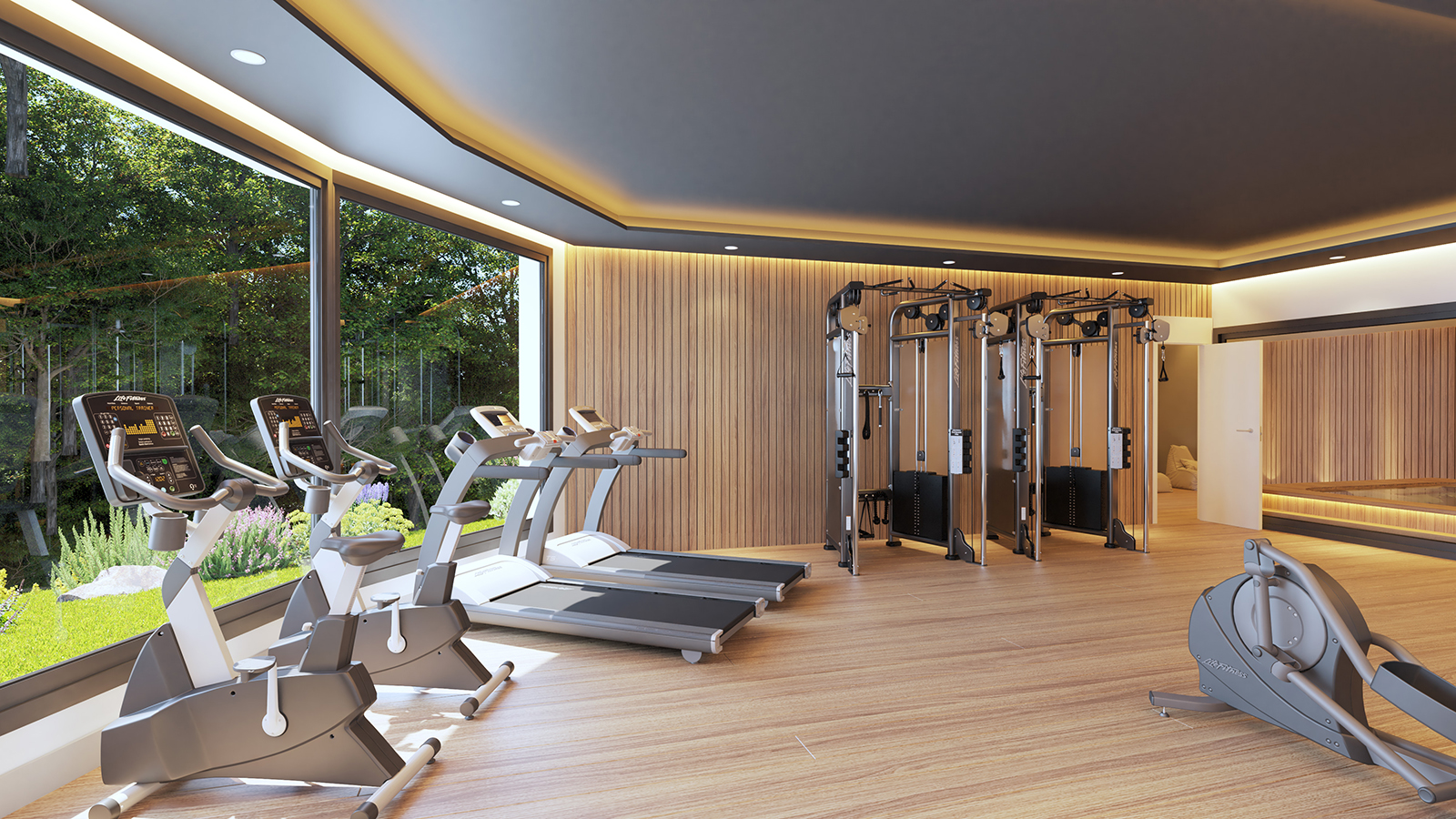 The residents’ leisure area features a fully equipped gym, sauna and jacuzzi, ensuring every day begins or ends in balance.