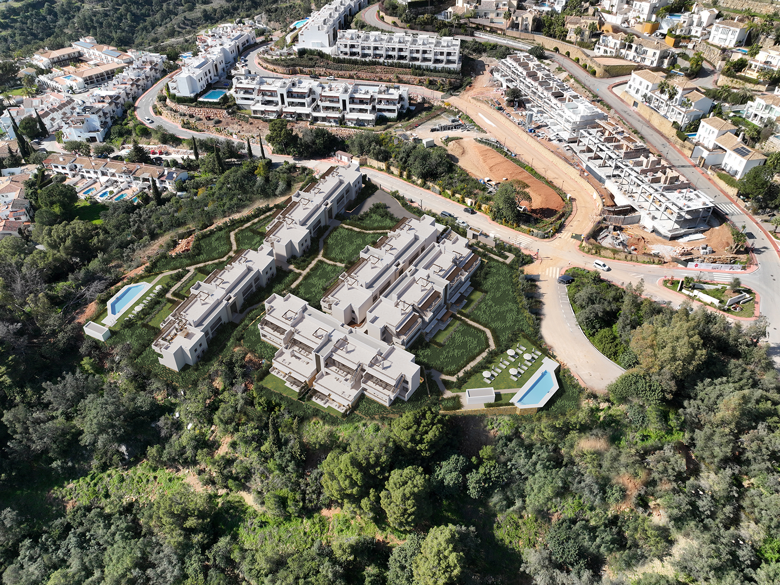 The new development is connected by wide roads with pavements, landscaped gardens, visitor parking and rural pathways amongst the forest areas so that you can relax in tune with nature. A unique residential experience on the Costa del Sol.