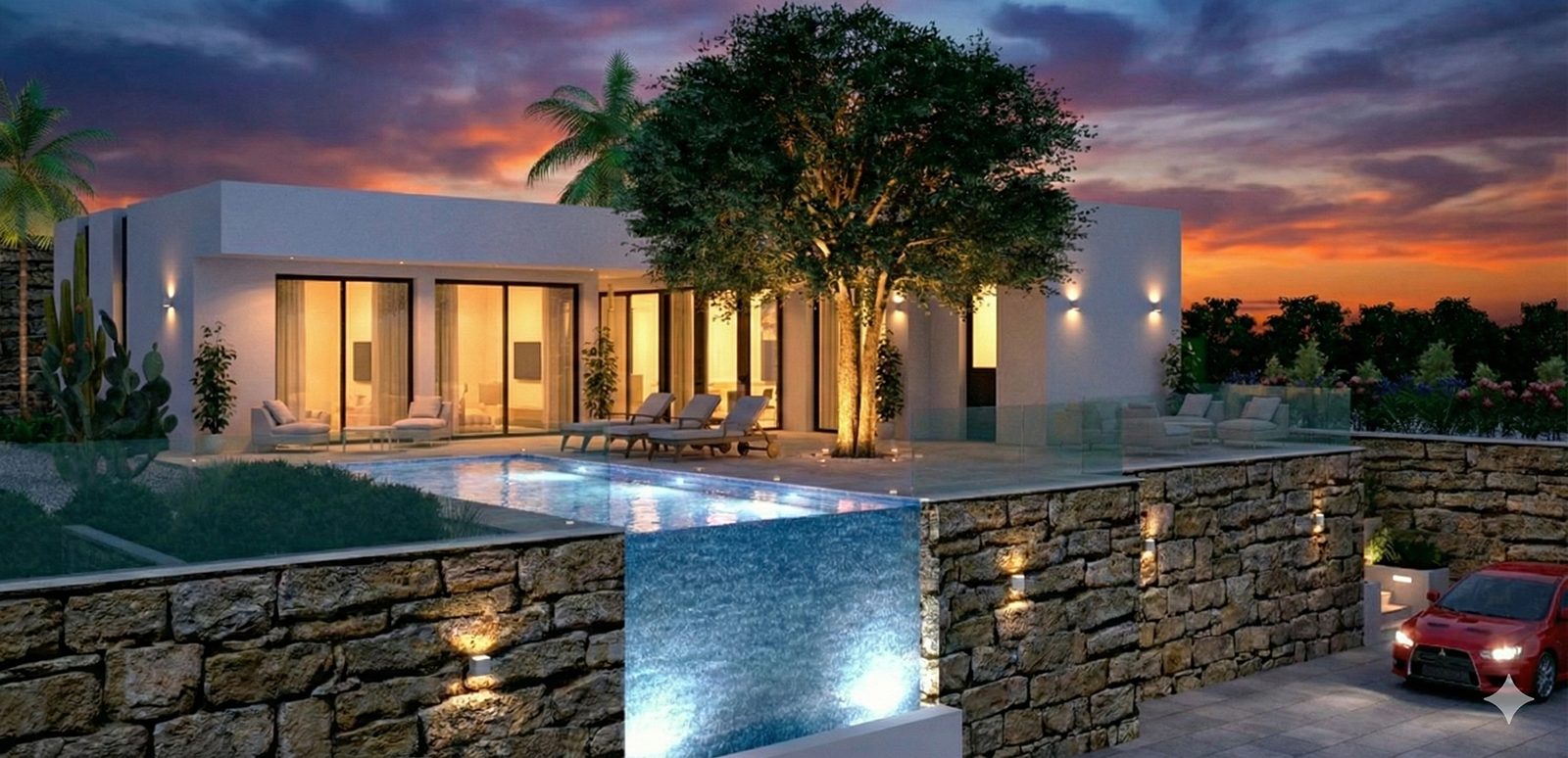 Designed for effortless comfort and luxury, each villa features an infinity pool with an outdoor shower, water-based underfloor heating, black-framed windows, a water softening system and a comprehensive interior package tailored to contemporary living. The technology package includes network sockets, integrated lighting solutions, spotlights for landscaped trees and pre-installation for an electric car charger. The outdoor spaces are beautifully finished with two palm trees and a decorative lemon tree that enhance the Mediterranean atmosphere. Beyond the privacy of your villa, the gated community offers its own reception and restaurant, making it an ideal turnkey residence or a hassle-free rental investment.